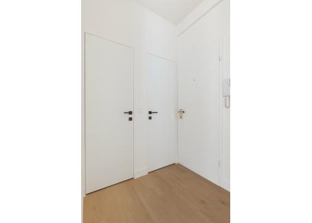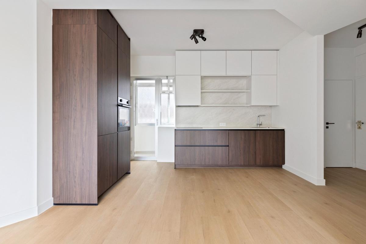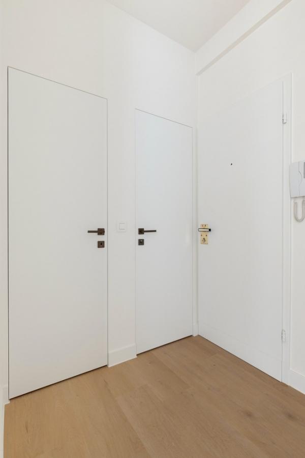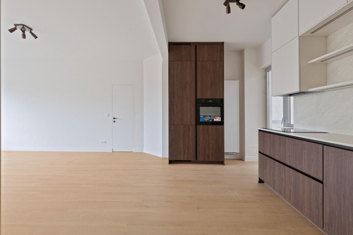 Via de vernieuwde inkomhal van het gebouw bereikt u de lift of trap naar de derde verdieping. Daar geeft de stijlvolle inkomhal van het appartement toegang tot de woonkamer op parket, die baadt in natuurlijk licht en sluit aan op de volledig vernieuwde open keuken, voorzien van alle modern comfort.