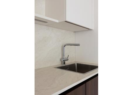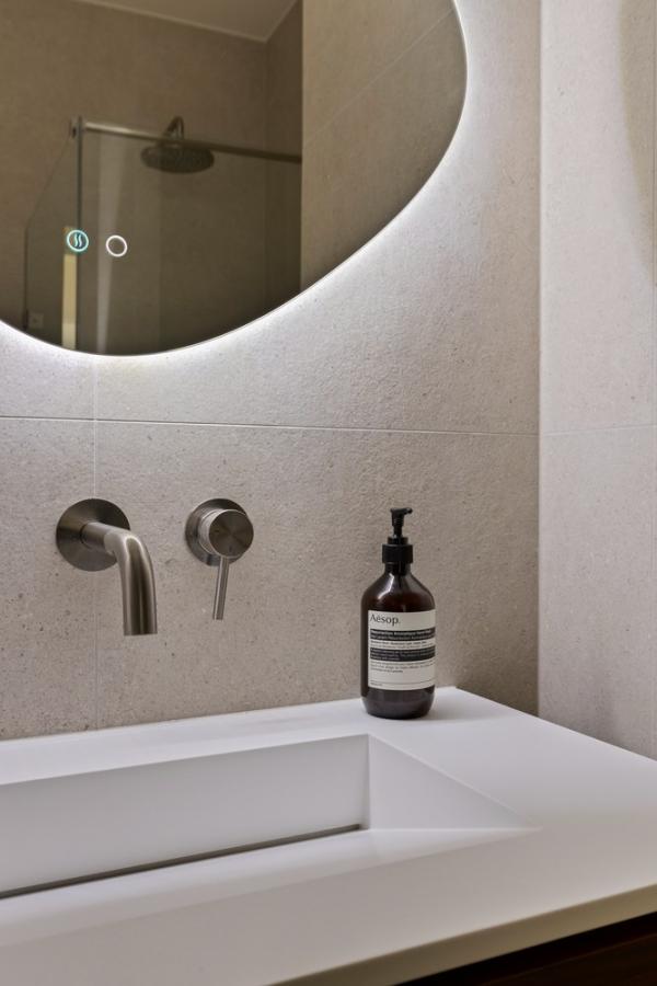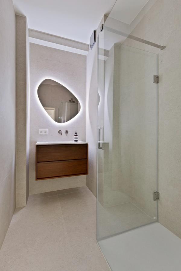 De badkamer is volledig betegeld en afgewerkt met kwaliteitsvolle materialen, voorzien van een elegant meubel met wastafel, inbouwkranen, een ruime inloopdouche en een geïntegreerde nis met ledverlichting die voor extra sfeer en gebruiksgemak zorgt.