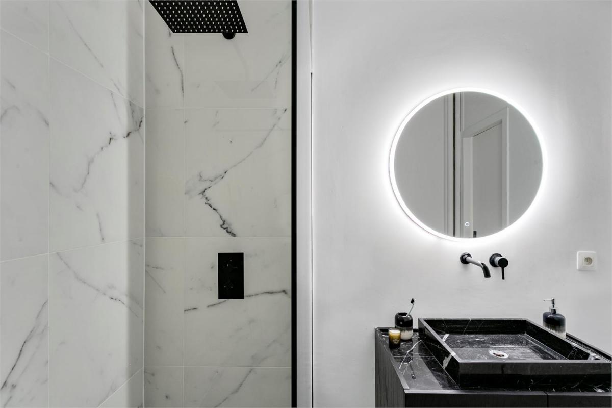 Ingericht; Prachtige badkamer met meubel met marmer wastafel en ruime inloopdouche.