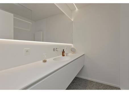 Via de prachtige trap bereikt u de eerste verdieping, waar u 3 ruime slaapkamers, 2 badkamers en een aparte toilet treft. De badkamer aan de kinderkamers is uitgerust met een brede wastafel en een volledig naadloze inloopdouche, beide afgewerkt in Kerrock. De badkamer aan de master bedroom beschikt eveneens over een wastafel, toilet, een naadloze inloopdouche en een ligbad, volledig afgewerkt in Kerrock. Aansluitend de master bedroom treft u een ingerichte dressing.